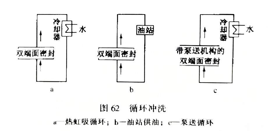 循環(huán)沖洗是經(jīng)過(guò)一個(gè)泵送設(shè)備使外加的密封流體進(jìn)行循環(huán)(圖62)。這里有兩點(diǎn)需引起留意,一是“泵送設(shè)備”,可以是外加的油站和密封腔構(gòu)成閉合回路進(jìn)行循環(huán),也可在密封腔中裝設(shè)一個(gè)泵,或者是用熱虹吸的原理使流體循環(huán)。另一點(diǎn)要留意的是“外加的密封流體”。這種沖刷方式用在雙端面或多端面密封上,在單端面密封上不采用。循環(huán)沖刷也有人稱為“外循環(huán)”。